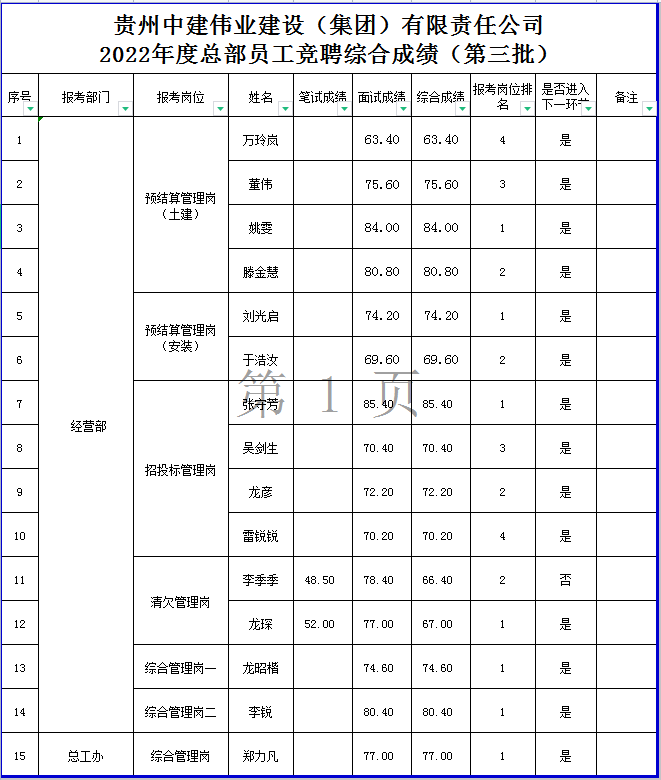 根據(jù)《貴州中建偉業(yè)建設(集團)有限責任公司總部員工競聘方案(第三批)》規(guī)定,經(jīng)報名、資格審查、面試等程序,現(xiàn)將綜合成績予以公示。